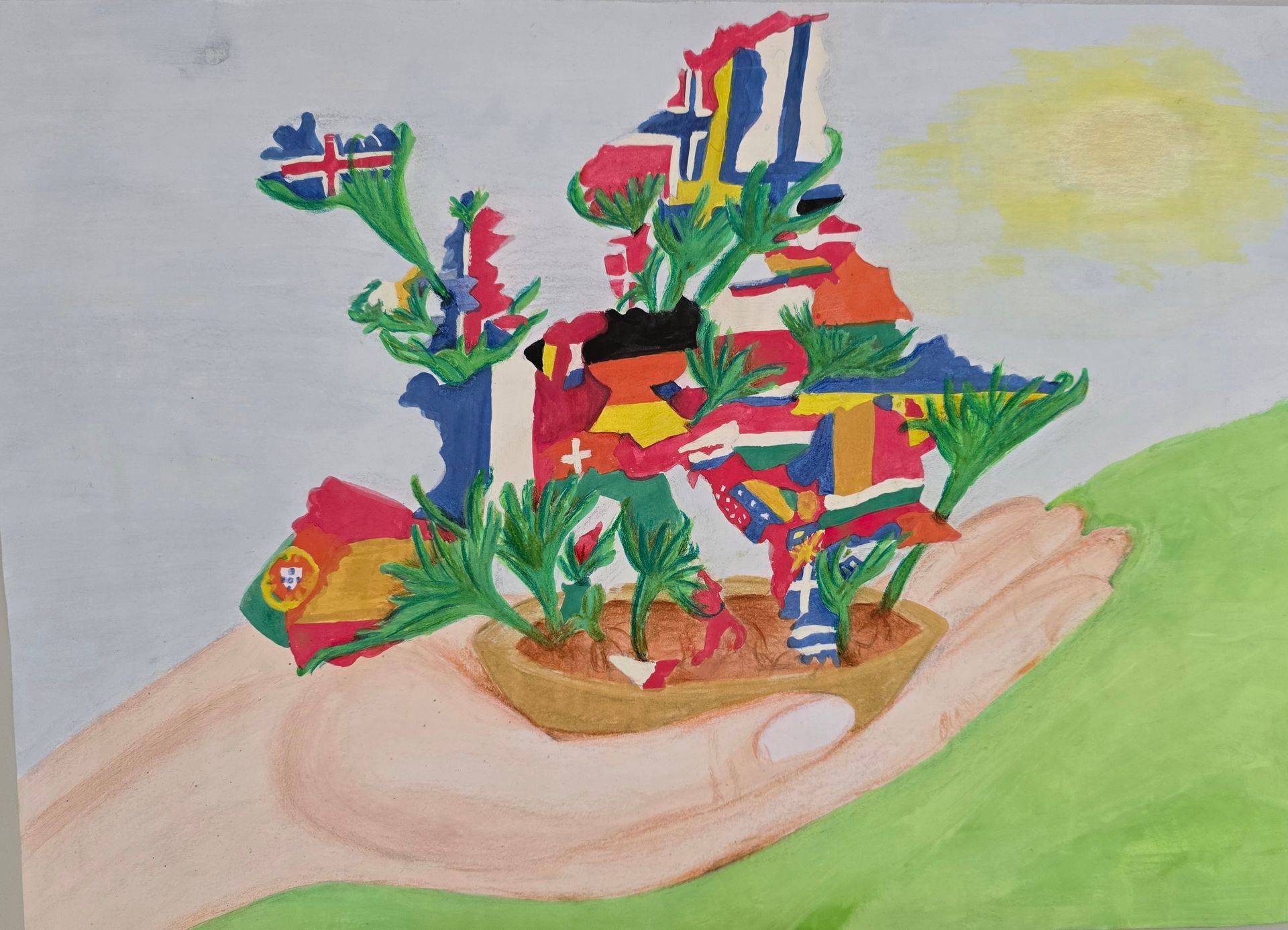 Ticia radelt auf ihrem Bild fröhlich mit Freunden auf einem Tandem durch die europäischen Länder, während Lilly darstellte, wie sie die aus einer Nussschale kräftig sprießende europäische Pflanze vorsichtig in der Hand hält.