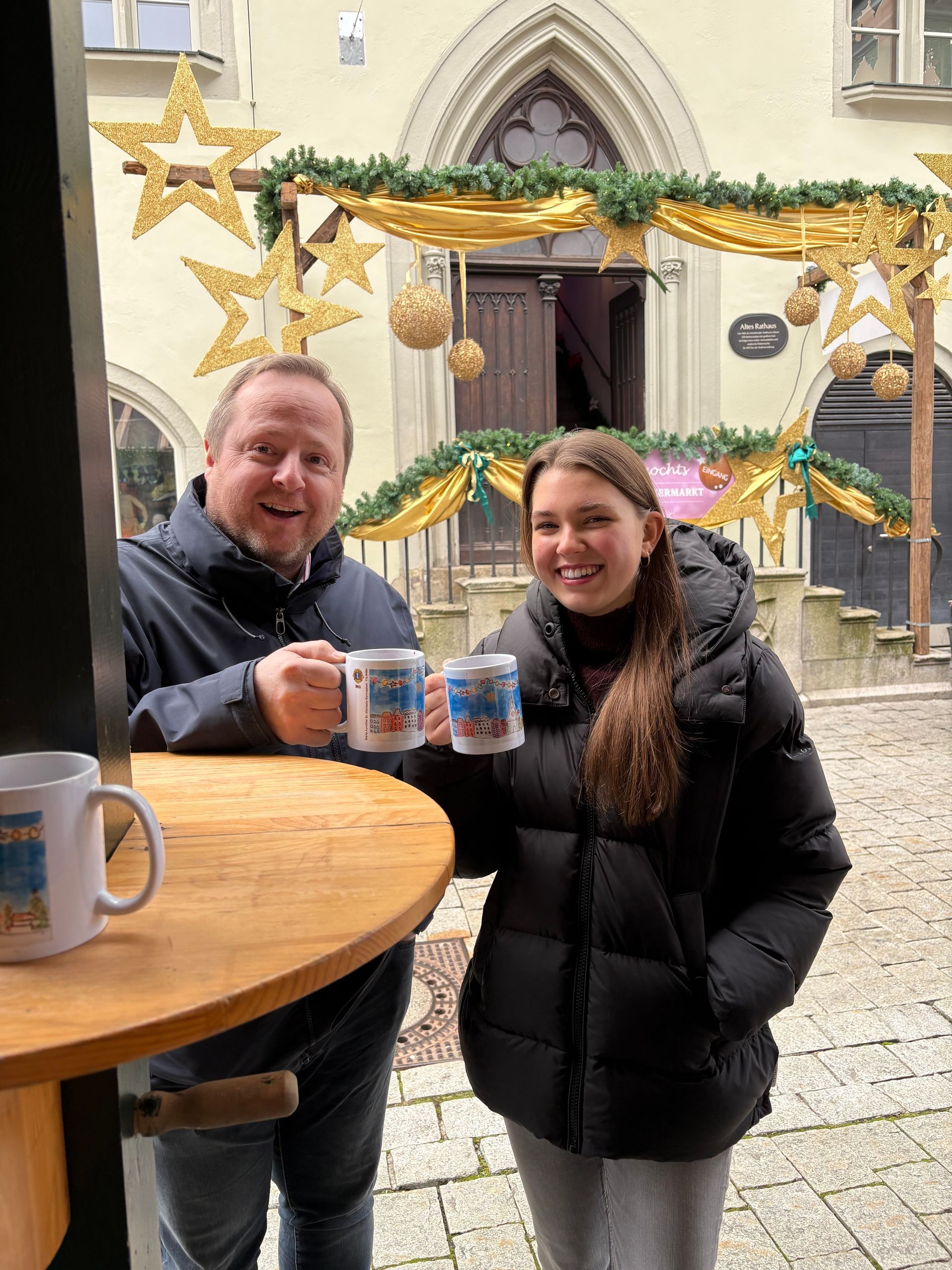 Marie Aumüller aus der Klasse 11a kann sich über den ersten Preis beim Wettbewerb des Lions-Clubs Deggendorf freuen. Hier musste ein ein weihnachtliches Motiv entworfen werden, mit dem die Tassen am Deggendorfer Weihnachtsmarkt bedruckt werden. Der Erlös der Aktion wird für einen guten Zweck verwendet.