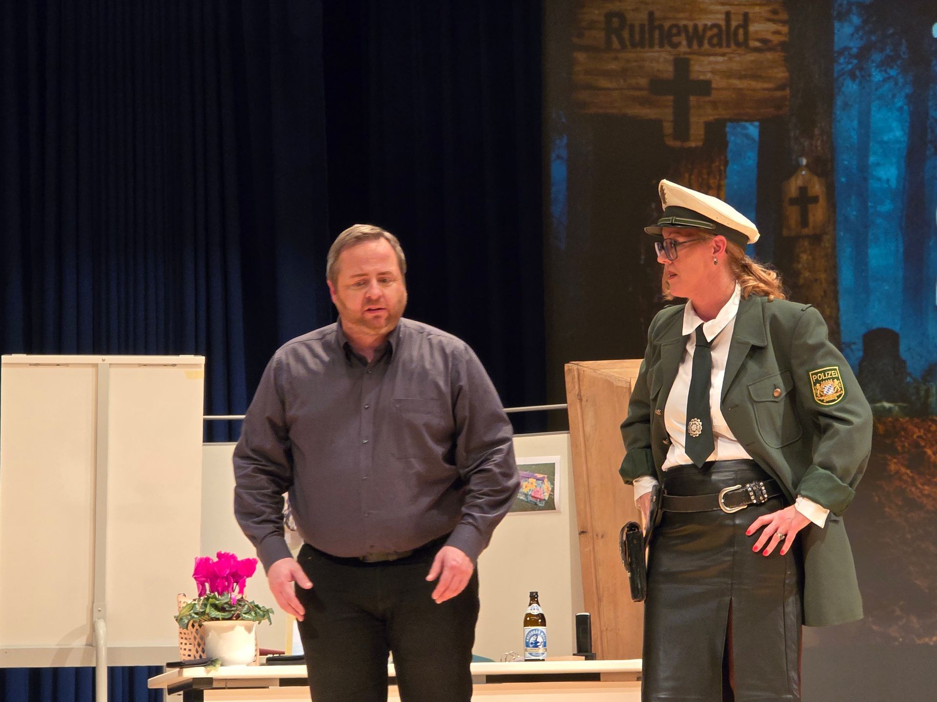 Sehr turbulent ging es zu im Stück „Bei uns liegen Sie richtig“, von Wolfgang Bräutigam, das die Theatergruppe des Mettener Lehrerkollegiums vergangene Woche zur Aufführung brachte. So prasseln die unerwarteten Ereignisse geradezu auf den Juniorchef des Bestattungsunternehmens Rupi Holmer ein: Anschuldigungen wegen Betrugs, Verdacht auf Mitwirkung bei einem Einbruch, Räumung aller Firmenkonten und zuletzt noch eine Geiselnahme im eigenen Haus. Um Zeit zu gewinnen und seine Unschuld zu beweisen, bleibt ihm nur der Ausweg, sich als tot auszugeben.