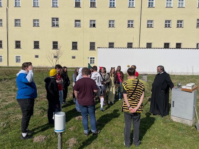 Kurz vor den Abiturprüfungen nutzten die Schülerinnen und Schüler des Leistungsfachs Geographie der Q13 in dieser Woche noch einmal die Gelegenheit, die Wetterstation im Klostergarten zu besichtigen. Dankenswerter nahm sich Pater Thomas Zeit für die illustre Gesellschaft, die im Rahmen der Mottowoche verkleidet als Bibi Blocksberg, Philip Lahm oder auch Biene Maja - je nach Kindheitsheld - kam. Pater Thomas gab gerne Einblick in die heutigen, größtenteils automatisierten Messverfahren, und zeigte anschaulich anhand älterer Messgeräte und Aufzeichnungen, wie aufwendig die Datenerhebung im Gegensatz dazu früher war. Das Thema Wetter und Klima begleitet die Schülerinnen und Schüler im Geographieunterricht seit der Unterstufe. Der Besuch am Ende der Schullaufbahn bildete daher einen gelungenen Abschluss, der Theorie und Praxis eindrucksvoll verband. An dieser Stelle sei Pater Thomas nochmals herzlich für sein Engagement gedankt.