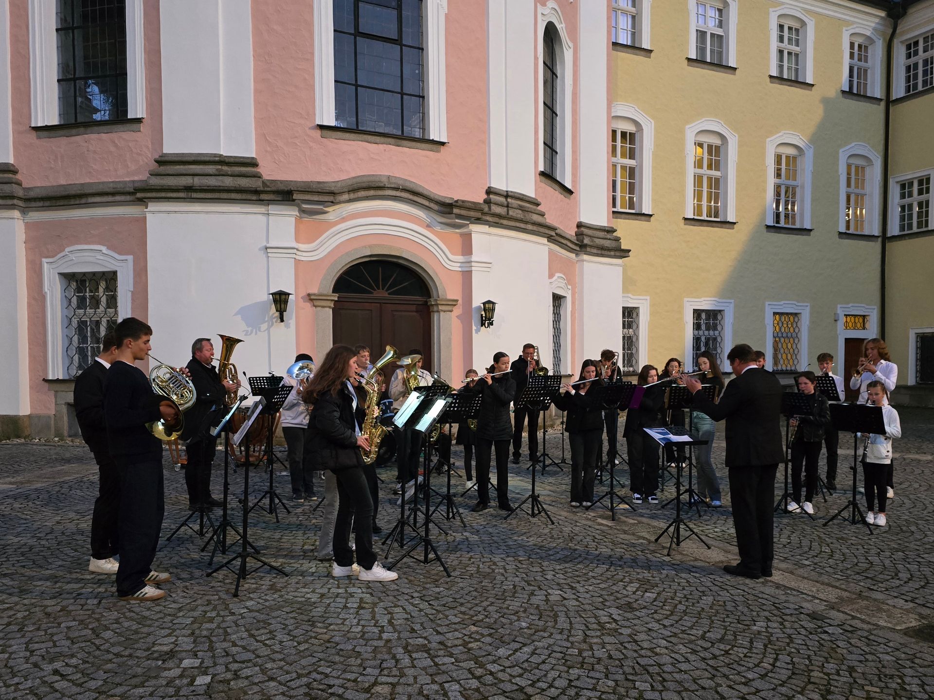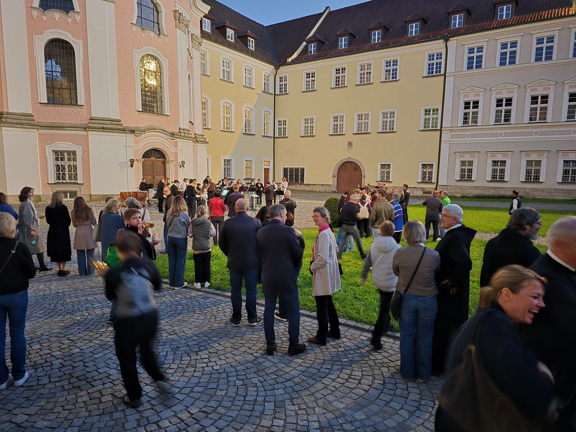 Hl. Michael, des Namenspatrons des Gymnasiums, von der Kloster- und Schulfamilie gefeiert wurde. Neben den Schülern und Lehrern konnte Abt Athanasius auch die Eltern unserer Schülerinnen und Schüler zum feierlichen Gottesdienst begrüßen. In seiner Festpr edigt erläuterte Abt Athanasius das Altarbild der Stiftskirche und rief dazu auf, statt Hass Vergebung walten zu lassen. Nach dem Gottesdienst, der vom Bläserensemble und vom Kammerchor unter der Leitung von Christoph Liebl musikalisch gestaltet wurde, war die Schulfamilie noch zum gemütlichen Beisammensein eingeladen. Hier sorgte das Standkonzert der Kalliope für Stimmung, außerdem wurden die zahlreichen Anwesenden von den Schülerinnen und Schülern der Oberstufe mit Leberkäse und Getränken versorgt.