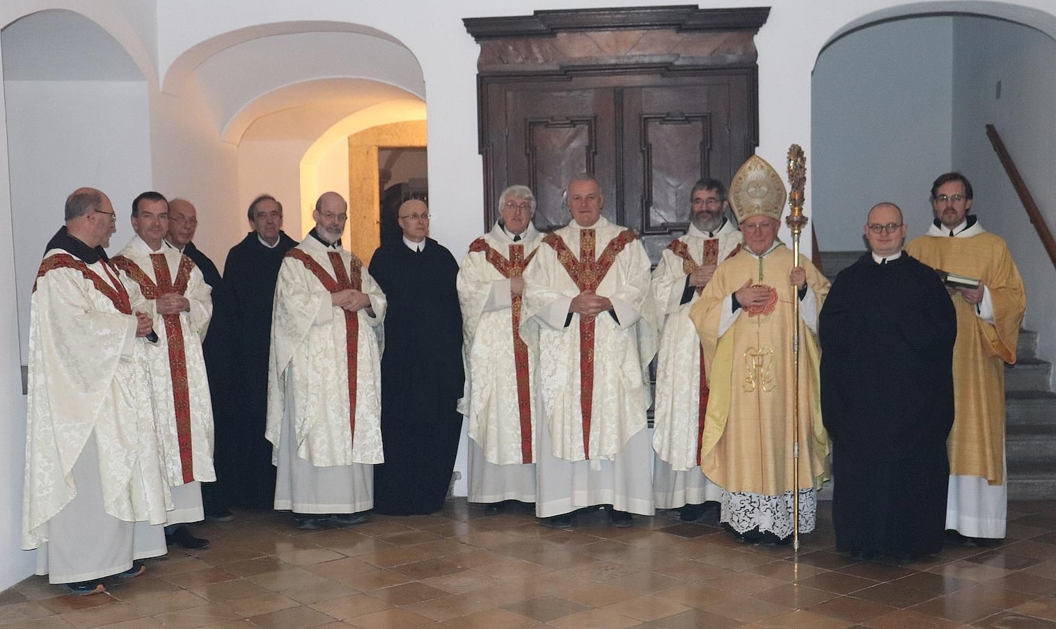 Metten. „Nach einer langen Reise bin ich nun am Ziel angekommen.“ Mit diesen Worten verband Pater Altmann Achatz OSB am Ende einer beeindruckenden Feier am vergangenen Montag in der Stiftskirche St. Michael in Metten seine Dankbarkeit und seine Freude über die abgelegte Ewige Profess. Damit gehört Pater Altmann, dessen Taufname Thomas lautet, nun ganz zum Konvent der Benediktinerabtei St. Michael zu Metten. Der gesamte Konvent versammelte sich, um mit Pater Altmann, dessen Familie, Weggefährten und Begleitern, befreundeten Priestern und einer Schar von Gläubigen aus der Pfarrei und darüber hinaus einen festlichen Gottesdienst in der Stiftskirche zu erleben, der getragen war von gregorianischen Gesängen der Chorschola der Benediktinerabtei sowie von Gesang und Musik des Pfarrverbandschores Metten-Neuhausen und des Kammerchors des St.-Michaels-Gymnasiums. Zusammen mit dem liturgischen Dienst zogen befreundete Priester von Pater Altmann sowie Angehörige des Mercedarier-Ordens und Mitglieder der Katholischen Österreichischen Landsmannschaft Josephina zu Wien in die Kirche ein. Unter den Gottesdienstbesuchern waren auch Mettens Bürgermeister Andreas Moser sowie für die Heimatstadt von Pater Altmann der stellvertretende Bürgermeister Jens Schlüter aus Zwiesel, der zusammen mit dem Zwieseler Stadtpfarrer Carl Christian Snethlage anreiste. In der Predigt spannte Abt Athanasius einen Bogen über den Lebenslauf von Thomas Achatz, der sich nun ganz dem Ordensleben verschreibt. Ausgehend von einer Erzählung der Odyssee des antiken Dichters Homer nannte der Mettener Klostervorsteher einzelne Lebensstationen von Pater Altmann als eine Reise mit mehreren Etappen, vielleicht sogar einer Irrfahrt durch das Leben, die nun am Ziel angekommen ist. Abt Athanasius griff auch marianische Gedanken auf und verwies auf die Begegnung Mariens mit ihrer Base Elisabeth. Er wünschte Pater Altmann Standfestigkeit im Glauben sowie in der klösterlichen Gemeinschaft und nahm ihn im Namen aller Konventualen herzlich in die Reihen der Mettener Benediktinermönche auf. Thomas Achatz fand den Weg über Pater Erhard Hinrainer OSB nach Metten. Nach dem Wortgottesdienst folgte die Professfeier. Zunächst folgten ein Heilig-Geist-Lied und die gesungene Allerheiligenlitanei. Pater Altmann legte sich im Altarraum auf den Boden, während Konvent, Priesterschar und gläubiges Volk um das Herabkommen des Heiligen Geistes beteten. Im Anschluss verlas Pater Altmann seine in lateinischer Sprache handschriftlich verfasste Professurkunde, signierte diese und zeigte sie jedem Mitglied des Konvents, beginnnend bei Abt Athanasius. Es kam schließlich der emotionalste Moment der Feier. Pater Altmann hat singend sein „Suscipe me, Domine“ vorgetragen. Bei dreimaliger Wiederholung durchschritt Pater Altmann des Presbyteriums und gelangte so an den obersten Stufen vor dem Hochaltar an. Kniend empfing er dann aus der Hand von Abt Athanasius die schwarze Kukulle. Am Ende des Gottesdienstes konnte Pater Altmann seinen Dank über die Feier und die Aufnahme in den Mettener Konvent zum Ausdruck bringen. Es war für ihn eine große Freude, seine Profess während des aktuell laufenden Heiligen Jahres ablegen zu dürfen. Sein Dank galt seinen Geschwistern, allen Wegbegleitern, den Mitwirkenden an der gottesdienstlichen Feier und vor allem den Mettener Mönchen, die einer Aufnahme in ihre Reihen zustimmten. Nach dem festlichen Gottesdienst folgte noch eine Agape-Feier in den Räumen des Benediktinerklosters. Zur Person von Pater Altmann: Thomas Achatz, Jahrgang 1975, geboren und aufgewachsen in Zwiesel im Bayerischen Wald, besuchte zunächst die Spätberufenenschule St. Josef in Fockenfeld in der Oberpfalz. Nach dem Abitur besuchte er das Internationale Priesterseminar St. Petrus in Wigratzbad und war später einige Zeit Mitglied im Institut St. Philipp Neri in Berlin. Es folgten Auslandsaufenthalte für verschiedene Studien in der Schweiz und in Österreich. Im Jahr 2007 wurde Thomas Achatz zum Diakon geweiht. Es folgte wenig später die Priesterweihe. So half er neben dem Studium und während seiner bisherigen monastischen Zeit jeweils in der Seelsorge. Als Trappist war er zugehörig zum inzwischen aufgelösten Trappistenkloster in Engelszell. Seit Herbst 2022 befand er sich im Übertritt aus dem Trappistenorden zum Benediktinerorden. Am Benediktusfest 2023 konnte Thomas Achatz vom damaligen Mettener Abt Wolfgang M. Hagl mit dem benediktinischen Habit eingekleidet werden. Er erhielt dabei den Namen des heiligen Bischof Altmann, den Patron seines Heimatbistums Passau, als klösterlichen Wegbegleiter und Ordensnamen an die Seite gestellt.