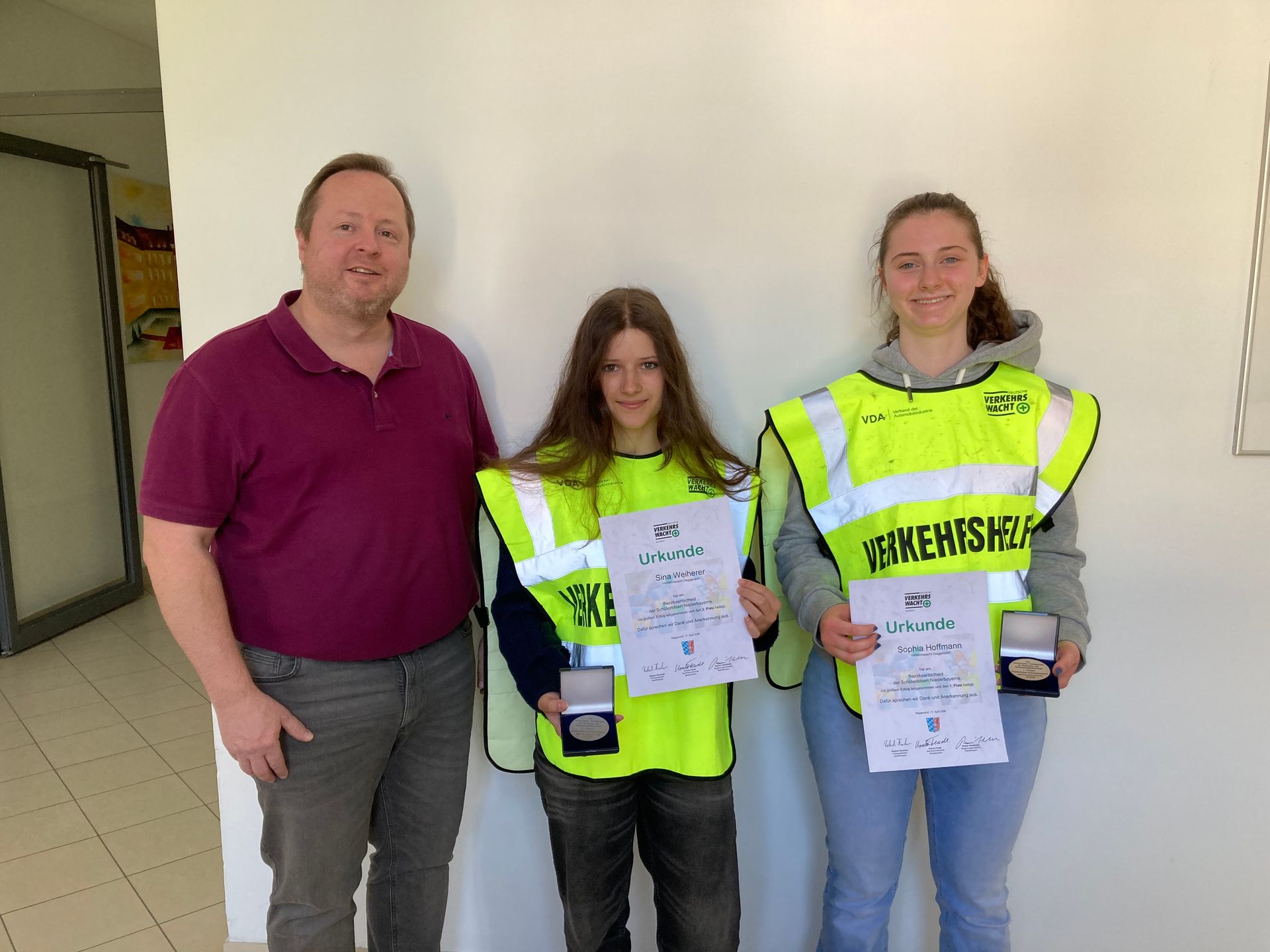 Sophia Hoffmann und Sina Weiherer sind die beste Schülerlotsinnen Niederbayerns Die beiden ersten Plätze beim Schülerlotsenwettbewerb in Deggendorf gingen vergangenen Freitag an Schülerinnen unseres Gymnasiums. Sophia Hoffmann aus der 10. Klasse erreichte den ersten Platz, Sina Weiherer aus der 11. Klasse durfte sich über den zweiten Platz freuen. Beide Schülerinnen dürfen somit am bayernweiten Wettbewerb in Eichstätt teilnehmen. Neben Fragen zur Verkehrssicherheit mussten im theoretischen Teil des Wettbewerbs auch Fragen zur Allgemeinbildung beantwortet werden. Im praktischen Teil galt es dann Entfernungen und Geschwindigkeiten zu schätzen. Auch ein Reaktionstest, bei dem möglichst schnell die Bremse gedrückt werden musste, gehörte zu den Disziplinen, die zuletzt für den Sieg entscheidend waren.