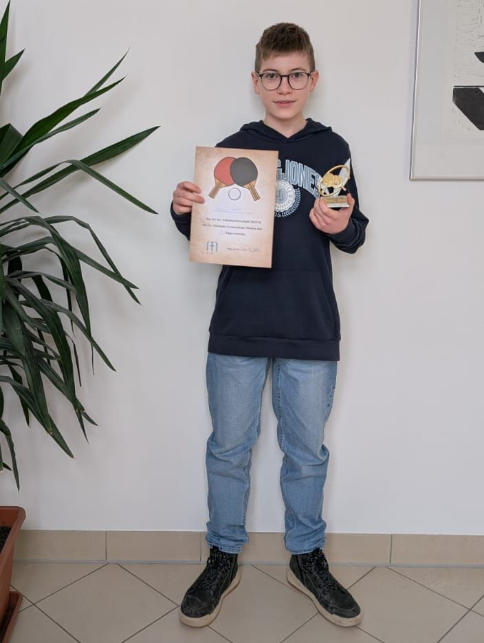 Bei unserer schulinternen Tischtennismeisterschaft für die Unter- und Mittelstufe konnten 18 topmotivierte Spieler aller Jahrgangsstufen begrüßt werden. Nach einer Vorrunde mit vier Gruppen konnten die beiden Topplatzierten jeweils ins Viertelfinale einziehen. Im darauffolgenden ersten Halbfinale war Vorjahressieger Raphael Hartl (8a) gegen Jonas Fischer (10a) nach hartem Kampf erfolgreich. Im zweiten Halbfinale hatte Kilian Späth (8b) gegen die Julian Döring (5b) die Nase vorn.
