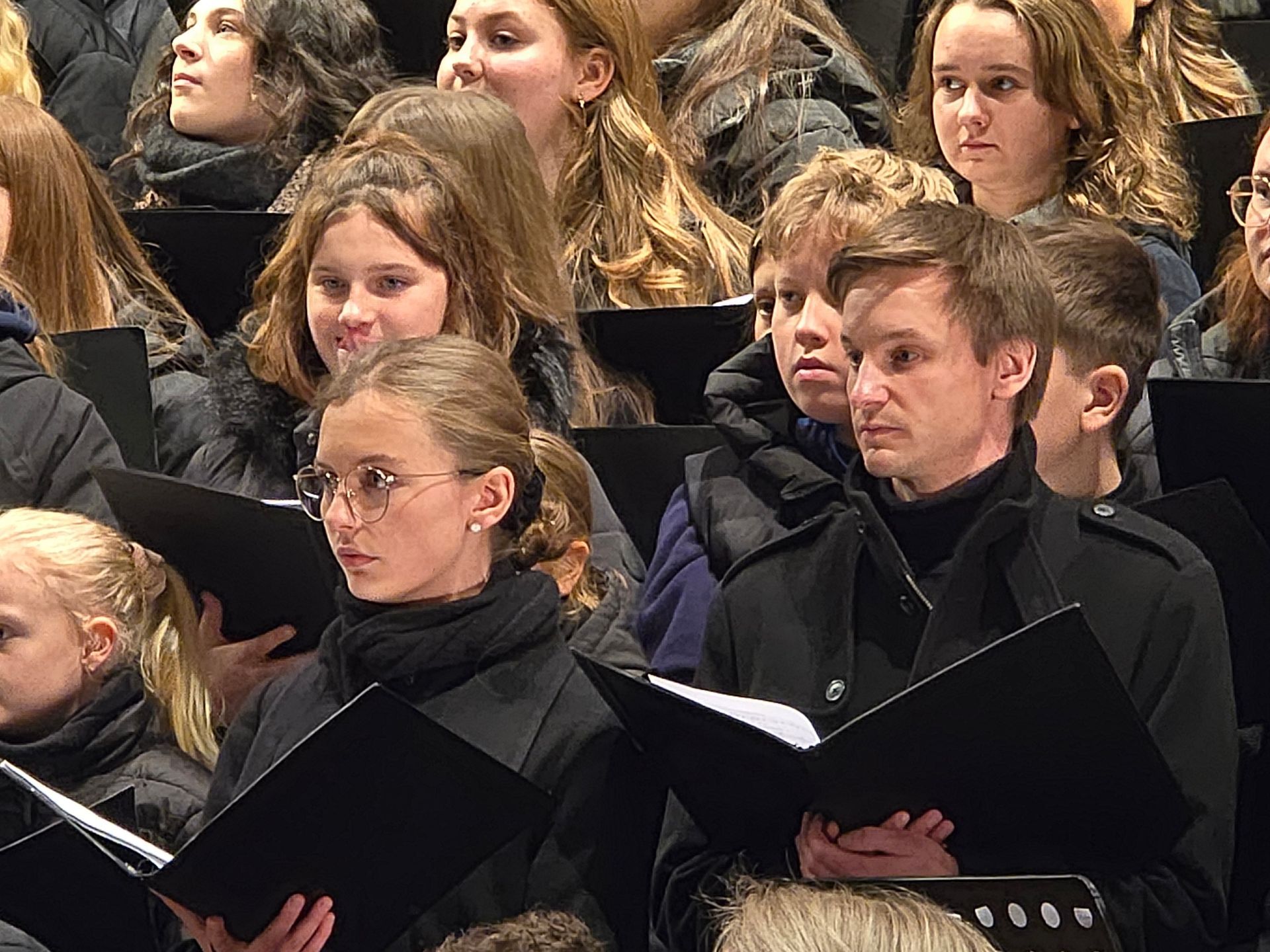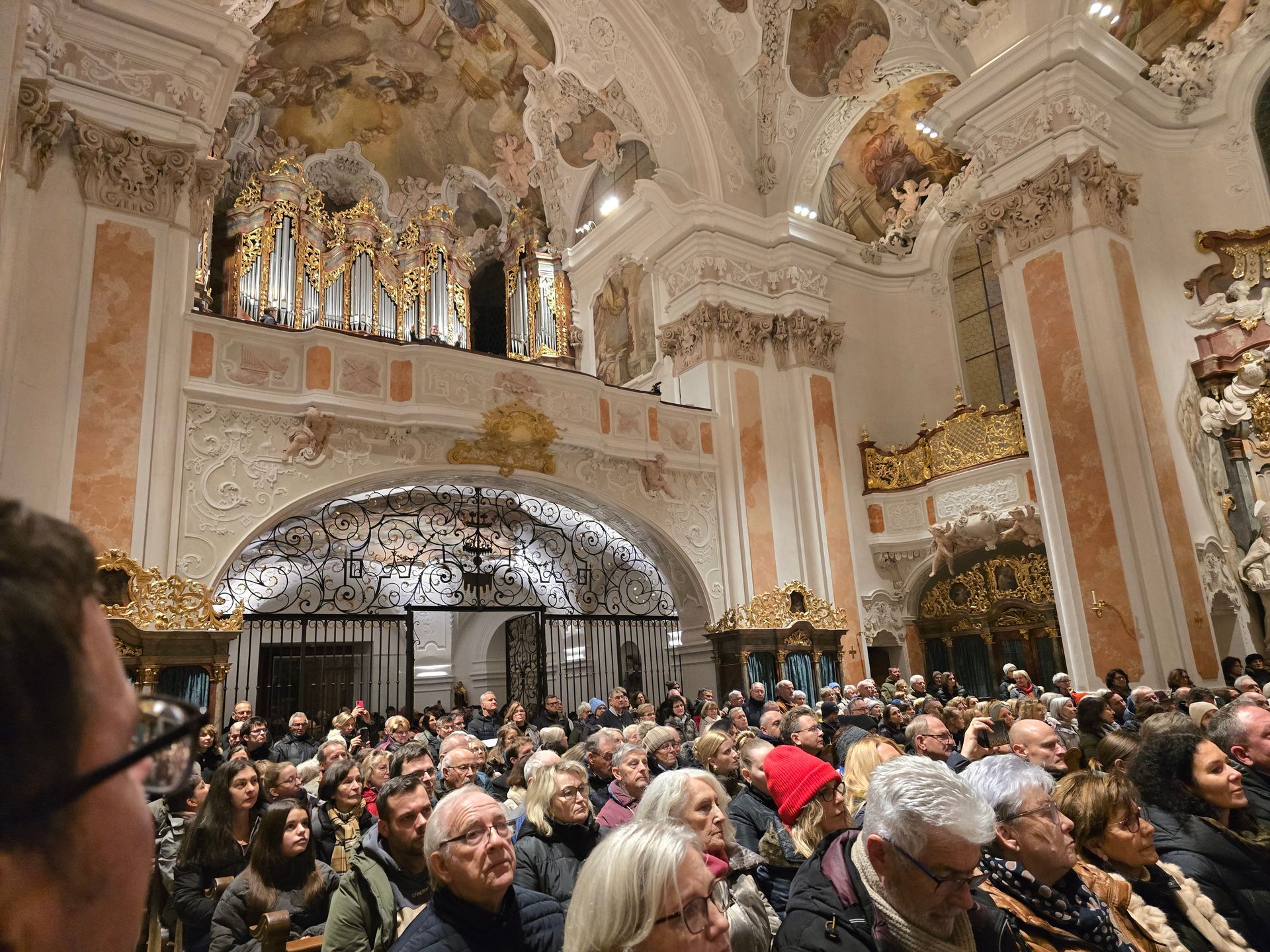 Viele Besucherinnen und Besucher aus Nah und Fern füllten unsere Stiftskirche, um die Uraufführung des „Bayerischen Weihnachtsoratoriums“ aus der Feder des jungen oberbayerischen Komponisten Andreas Begert aus Dorfen bei Erding im diesjährigen Mettener Weihnachtssingen am 2. Adventssonntag zu erleben. Er hat das Werk für die Schülerinnen und Schüler des St.-Michaels-Gymnasiums geschrieben und wirkte selbst als Sprecher auf der Kanzel mit. In bayerischer Mundart verfasst, spannt es in 14 Teilen („Da Kini im Himme“ – „A Engal und d’Maria“ – „Da Josef alloa“ – „Josef und Maria auf’m Weg noch Bethlehem“ – „Verschlossene Türn“ – „I bin a Engal“ – „Im Stoi, Ochs und Esel“ – Da Hirt“ – „De Geburt Jesu in da Kripp’n“ – „Staad is worn“ – „A Liacht über Bethlehem“ – „De heilig drei Kini“ – „Engal-G’sangal“ – „Tanz’n und Jauchz’n“) inhaltlich einen großen Bogen über den Weihnachtsfestkreis. Prachtvolle Chöre, meditative Soloteile und mitreißende Tanzmusik des knapp 90-minütigen Werkes begeisterten die Zuhörerinnen und Zuhörer. Gudrun Rauch dirigierte auf der Empore die Chorklassen der 6. und 7. Jahrgangsstufe und das Blechbläserensemble mit Regionalkantor Pius Schuhbaum an der Orgel. Die Bläser und Streicher des Orchesters, die Chorklasse der 5. Jahrgangsstufe und der Große Schulchor im Altarraum standen unter der Leitung von Christoph Liebl. Mit ihrem bezaubernden Sopran faszinierte Anna Biller (11b) als Maria und Engel das Publikum, Bastian Wagner (Tenor) überzeugte als Josef und Hirte. Lang anhaltender Applaus belohnte die über 200 Mitwirkenden für ihre außerordentliche musikalische Leistung.