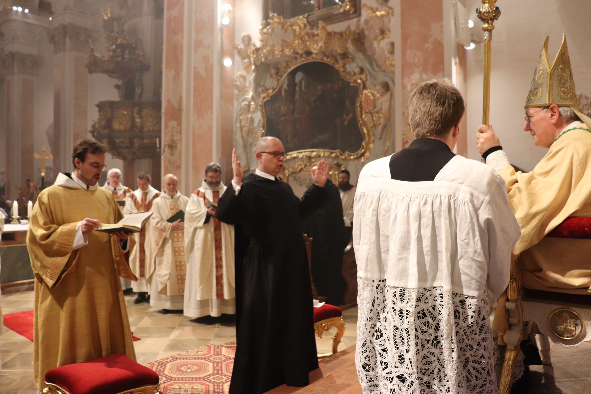 Pater Altmann Achatz OSB legt feierlich die Ewige Profess ab Metten. „Nach einer langen Reise bin ich nun am Ziel angekommen.“ Mit diesen Worten verband Pater Altmann Achatz OSB am Ende einer beeindruckenden Feier am vergangenen Montag in der Stiftskirche St. Michael in Metten seine Dankbarkeit und seine Freude über die abgelegte Ewige Profess. Damit gehört Pater Altmann, dessen Taufname Thomas lautet, nun ganz zum Konvent der Benediktinerabtei St. Michael zu Metten. Der gesamte Konvent versammelte sich, um mit Pater Altmann, dessen Familie, Weggefährten und Begleitern, befreundeten Priestern und einer Schar von Gläubigen aus der Pfarrei und darüber hinaus einen festlichen Gottesdienst in der Stiftskirche zu erleben, der getragen war von gregorianischen Gesängen der Chorschola der Benediktinerabtei sowie von Gesang und Musik des Pfarrverbandschores Metten-Neuhausen und des Kammerchors des St.-Michaels-Gymnasiums. Zusammen mit dem liturgischen Dienst zogen befreundete Priester von Pater Altmann sowie Angehörige des Mercedarier-Ordens und Mitglieder der Katholischen Österreichischen Landsmannschaft Josephina zu Wien in die Kirche ein. Unter den Gottesdienstbesuchern waren auch Mettens Bürgermeister Andreas Moser sowie für die Heimatstadt von Pater Altmann der stellvertretende Bürgermeister Jens Schlüter aus Zwiesel, der zusammen mit dem Zwieseler Stadtpfarrer Carl Christian Snethlage anreiste. In der Predigt spannte Abt Athanasius einen Bogen über den Lebenslauf von Thomas Achatz, der sich nun ganz dem Ordensleben verschreibt. Ausgehend von einer Erzählung der Odyssee des antiken Dichters Homer nannte der Mettener Klostervorsteher einzelne Lebensstationen von Pater Altmann als eine Reise mit mehreren Etappen, vielleicht sogar einer Irrfahrt durch das Leben, die nun am Ziel angekommen ist. Abt Athanasius griff auch marianische Gedanken auf und verwies auf die Begegnung Mariens mit ihrer Base Elisabeth. Er wünschte Pater Altmann Standfestigkeit im Glauben sowie in der klösterlichen Gemeinschaft und nahm ihn im Namen aller Konventualen herzlich in die Reihen der Mettener Benediktinermönche auf. Thomas Achatz fand den Weg über Pater Erhard Hinrainer OSB nach Metten. Nach dem Wortgottesdienst folgte die Professfeier. Zunächst folgten ein Heilig-Geist-Lied und die gesungene Allerheiligenlitanei. Pater Altmann legte sich im Altarraum auf den Boden, während Konvent, Priesterschar und gläubiges Volk um das Herabkommen des Heiligen Geistes beteten. Im Anschluss verlas Pater Altmann seine in lateinischer Sprache handschriftlich verfasste Professurkunde, signierte diese und zeigte sie jedem Mitglied des Konvents, beginnnend bei Abt Athanasius. Es kam schließlich der emotionalste Moment der Feier. Pater Altmann hat singend sein „Suscipe me, Domine“ vorgetragen. Bei dreimaliger Wiederholung durchschritt Pater Altmann des Presbyteriums und gelangte so an den obersten Stufen vor dem Hochaltar an. Kniend empfing er dann aus der Hand von Abt Athanasius die schwarze Kukulle. Am Ende des Gottesdienstes konnte Pater Altmann seinen Dank über die Feier und die Aufnahme in den Mettener Konvent zum Ausdruck bringen. Es war für ihn eine große Freude, seine Profess während des aktuell laufenden Heiligen Jahres ablegen zu dürfen. Sein Dank galt seinen Geschwistern, allen Wegbegleitern, den Mitwirkenden an der gottesdienstlichen Feier und vor allem den Mettener Mönchen, die einer Aufnahme in ihre Reihen zustimmten. Nach dem festlichen Gottesdienst folgte noch eine Agape-Feier in den Räumen des Benediktinerklosters. Zur Person von Pater Altmann: Thomas Achatz, Jahrgang 1975, geboren und aufgewachsen in Zwiesel im Bayerischen Wald, besuchte zunächst die Spätberufenenschule St. Josef in Fockenfeld in der Oberpfalz. Nach dem Abitur besuchte er das Internationale Priesterseminar St. Petrus in Wigratzbad und war später einige Zeit Mitglied im Institut St. Philipp Neri in Berlin. Es folgten Auslandsaufenthalte für verschiedene Studien in der Schweiz und in Österreich. Im Jahr 2007 wurde Thomas Achatz zum Diakon geweiht. Es folgte wenig später die Priesterweihe. So half er neben dem Studium und während seiner bisherigen monastischen Zeit jeweils in der Seelsorge. Als Trappist war er zugehörig zum inzwischen aufgelösten Trappistenkloster in Engelszell. Seit Herbst 2022 befand er sich im Übertritt aus dem Trappistenorden zum Benediktinerorden. Am Benediktusfest 2023 konnte Thomas Achatz vom damaligen Mettener Abt Wolfgang M. Hagl mit dem benediktinischen Habit eingekleidet werden. Er erhielt dabei den Namen des heiligen Bischof Altmann, den Patron seines Heimatbistums Passau, als klösterlichen Wegbegleiter und Ordensnamen an die Seite gestellt.