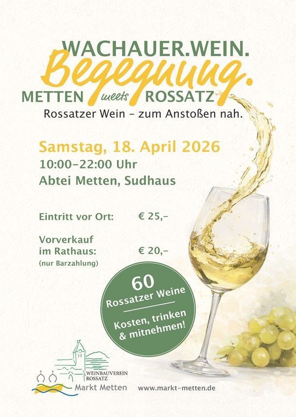 Am Samstag, 18.04.2026 wollen Metten und Rossatz nach dem Motto WACHAUER.WEIN.BEGEGNUNG. ab 10 Uhr in der Abtei Metten erneut ein klares Zeichen setzen: Freundschaft und Partnerschaft zwischen Gemeinden wachsen durch Begegnungen und manchmal auch durch ein gutes Glas Wein. Dem Rossatzer Wein – zum Anstoßen nah.